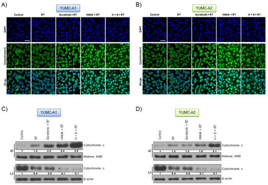 DNA damage is known to induce apoptosis by releasing cytochrome c from mitochondria [33]. To assess the mechanism of apoptosis induced by the combination of HNHA, sorafenib, and radiation, we evaluated the expression of cytochrome c and caspases with immunofluorescence and immunoblot analysis (Figure 5). Results from the immunofluorescence indicated that cytochrome c was located and accumulated in the nuclear, thus proposing that combination of HNHA, sorafenib, and radiation caused apoptosis via a cytochrome-c-dependent pathway in undifferentiated thyroid cancer cell lines, YUMC-A1 (Figure 5A,C) and YUMC-A2 (Figure 5B,D). Immunoblot analysis after subcellular fractionation confirmed that cytochrome c was translocated into the nucleus after combination treatment with HNHA, sorafenib and radiation (Figure 5C,D). In summary, these results suggest the combination of HNHA, sorafenib, and radiation induces apoptosis via caspase- and cytochrome-c-dependent pathways in undifferentiated thyroid cancer cells.