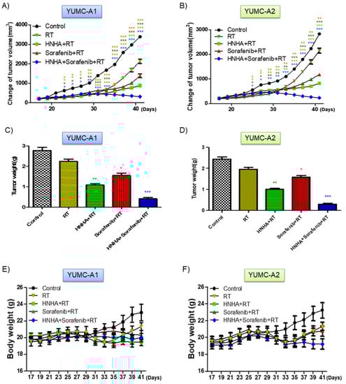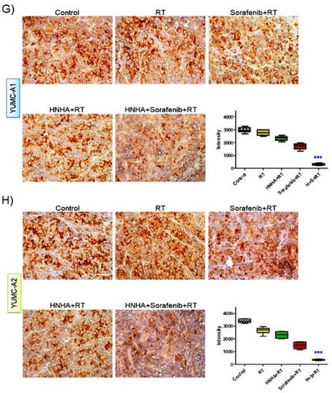 For in vitro tests, YUMC-A1 and YUMC-A2 cells were irradiated used Faxitron X-ray machine (Faxitron Bioptics, Tucson, AZ, USA) at 3–5 Gray (Gy), followed by treatment with HNHA or sorafenib alone and the combination of HNHA / sorafenib. For this experiment, mice were treated with the Small Animal Radiation Research Platform (SARRP) [High-resolution, small animal radiation study platform with x-ray tomographic guidance capabilities [62]. The tumors were irradiated with a circular beam of 1cm diameter with three successive daily fractions of 3 Gy.