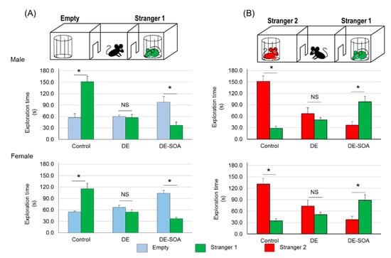 Sociability and preference for social novelty tests were performed as reported previously [21]. The apparatus used was a rectangular, three-chambered Plexiglas box (100 cm × 100 cm × 35 cm), with equal-sized chambers. The dividing partitions were also made of clear Plexiglas, with small doorways on each (10 cm × 10 cm) that allowed free access for the animals among the chambers. Wired cups (diameter, 15 cm; height, 30 cm) were placed in each of the side chambers to house unfamiliar animals. For habituation, the subject rats from three different groups (DE- or DE-SOA-exposed and the control rats) were placed in the middle chamber and allowed to explore for 5 min. During the habituation phase, the wired cup in each of the side chambers was empty (E). Following habituation, for the sociability test, an unfamiliar rat (stranger 1 (S1), age-matched rat) was placed in the wired cup in one of the side chambers; the subject rats were allowed to explore for 10 min. The location of stranger 1 in the left- or right-side chamber was systematically alternated between trials. The social novelty preference test was performed immediately after the sociability test. For this test, another unfamiliar rat (stranger 2 (S2), age-matched rat) was placed in the wired cup on the other side that had been empty during the first 10 min session, and the subject rat was allowed to explore the two strangers for 10 min. The time spent exploring the wired cups on either side was measured. The time that the subject rat spent exploring the wired cup was measured as the time spent with its head facing the cup from a distance of within 1 cm.
