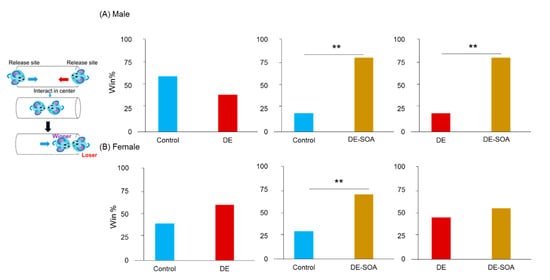 Assessment of social dominance behavior using tube test. Social dominance behavior in (A) male and (B) female rats of the control and the DE- and DE-SOA-exposed rats (n = 16, ** p < 0.01 vs. corresponding control or DE-exposed rats).