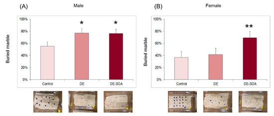 Assessment of repetitive behavior using marble burying test. Repetitive behavior in (A) male and (B) female rats of the control and the DE- and DE-SOA-exposed rats (n = 16, ** p < 0.01, * p < 0.05 vs. corresponding control).