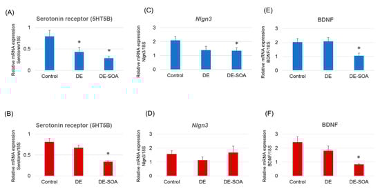 mRNA expression levels of neurological biomarkers. (A,B) Serotonin receptor 5HT5B, (C,D) Nlgn3, and (E,F) brain-derived neurotrophic factor (BDNF) in the prefrontal cortex of the control and the DE- and DE-SOA-exposed male and female rats. (n = 14, control; * p < 0.05 vs. control).