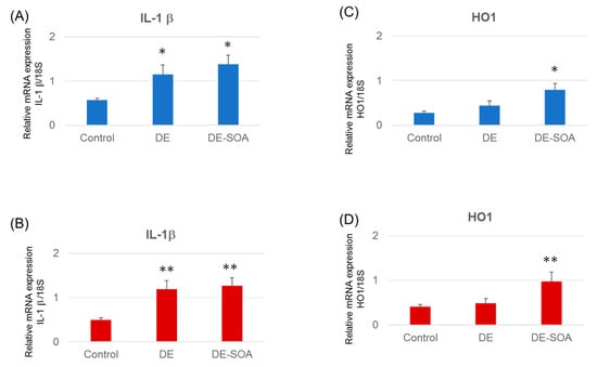 mRNA expression levels of immunological biomarkers. (A,B) IL1-β and (C,D) HO-1 in the prefrontal cortex of the control and the DE- and DE-SOA-exposed male and female rats. (n = 14, ** p < 0.01 vs. control; * p < 0.05 vs. control).
