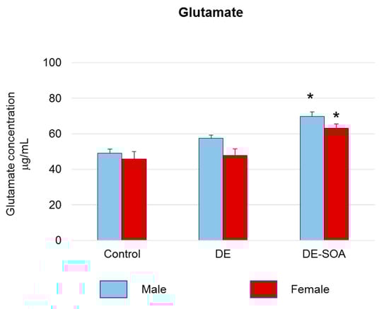 Excessive glutamate level is the indicator of neurotoxicity. We measured glutamate concentration in the prefrontal cortex and found that glutamate secretion was increased remarkably in both male and female rats exposed to DE-SOA compared with the control rats (* p < 0.05) (Figure 6).