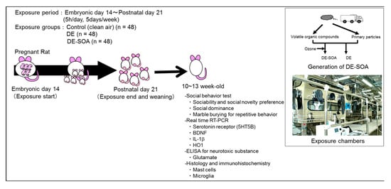 Forty-eight timed pregnant Sprague–Dawley rats (gestational day (GD) 8) were purchased from Oriental Yeast Co., Ltd. (Tokyo, Japan) and exposed to clean air (control, n = 16), DE (n = 16), and DE-SOA (n = 16) from GD 14 to postnatal day (PND) 21 in whole-body exposure chambers. Food and water were given ad libitum. Date of birth was recorded as PND 0 and the offspring were housed in cages with dam under controlled environmental conditions (temperature, 22 ± 0.5 °C; humidity, 50 ± 5%; lights on 07:00–19:00 h). The pregnant rats were exposed in the exposure chamber for 5 h per day (from 10:00 p.m. to 3:00 a.m.), 5 days a week excluding weekends from gestational day 14 to postnatal day 21 with their pups.