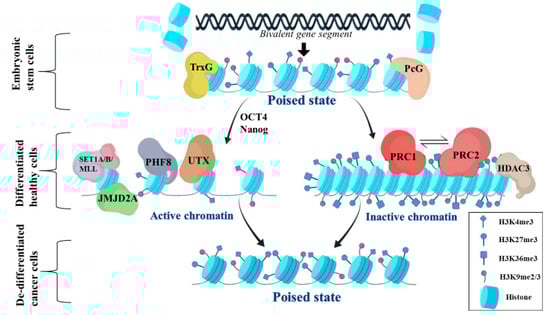 Bivalent genes and cell differentiation. Embryonic stem cells (ESCs) have the potential to quickly change the expression levels of a gene through the mechanism of bivalency. Bivalent genes carry both inducing signals, such as H3K4me3 methylation, as well as repressive signals, such as H3K27me3 methylation, H3K9me2/3 methylation, and H3K36me3 methylation. The formation and control of bivalent genes are mostly regulated by TrxG and PcG that keep bivalent genes in a ‘poised’ state. Activating signals induce the deposition of H3K4me3 by SET1A/B/MLL, the removal of H3K27me3 marks by UTX, and the removal of H3K9me2/3 marks by PHF8 and JMJD2A, making chromatin more active and transcriptionally accessible. On the other hand, inhibitory signals promote the deacetylation of H3K4 by HDAC3 and the deposition of H3K27me3 by PRC2, which aim to suppress gene transcription and induce chromatin inactivation. PRC1 deposits the H3K36me3 mark, which interacts with PRC2 and promotes its binding. PRC1 can also be recruited by PRC2. Previously differentiated cells that undergo malignant transformation may acquire a stem cell-like phenotype by silencing the expression of some bivalent genes while maintaining the expression of others. This leads to the dedifferentiation of neoplastic cells and promotes the regeneration of stem cell properties in cancer cells.