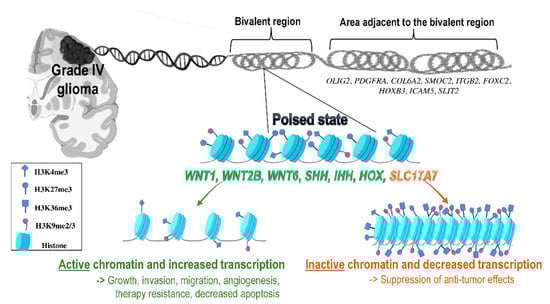 Interestingly, a recent study also demonstrated that the tumor suppressor gene Solute Carrier Family 17 Member 7 (SLC17A7) was also bivalently controlled in GBM [59]. Downregulation of both mRNA and protein levels of SLC17A7 was observed in tumor cells compared to normal brain tissues, and it was suggested that cancer cells take advantage of bivalency to silence this gene, preventing its tumor-suppressive activity (Figure 2). Indeed, overexpression of this gene resulted in reduced proliferation, migration, and invasion in GBM cells.