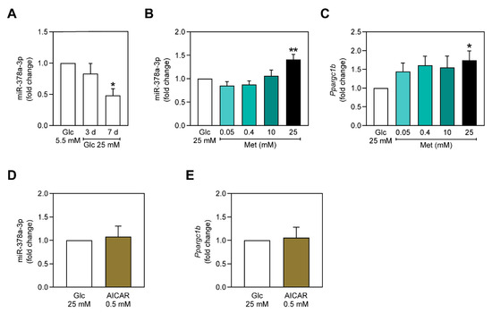 Figure 1. Higher concentrations of metformin upregulate miR-378a-3p and Ppargc1b in C2C12 myoblasts independently of AMPK. (A) miR-378a-3p expression in C2C12 cells after being exposed to 25 mM glucose for 3 and 7 days. (B) miR-378a-3p and (C) Ppargc1b expression in C2C12 myoblasts incubated with 0.05, 0.40, 10 and 25 mM of metformin. (D) miR-378a-3p expression and (E) Ppargc1b expression after incubation with 0.5 mM AICAR. All data is given as mean ± S.E.M. (n = 3). * p < 0.05, ** p = 0.0019 vs. Glc 25 mM.