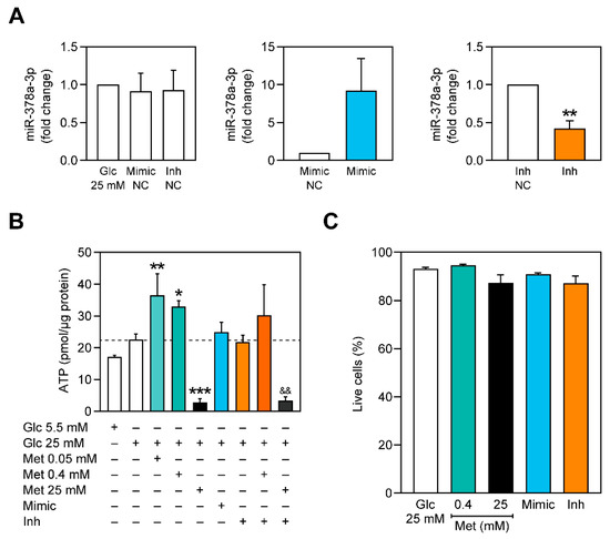 Figure 2. Lower concentrations of metformin increase ATP content in C2C12 myoblasts but this effect is impaired in cells with miR-378a-3p inhibited. (A) Expression levels of miR-378a-3p after transfection with mimic and inhibitor negative controls (Mimic NC and Inh NC, respectively), and with miR-378a-3p mimic and inhibitor in cells exposed to glucose 25 mM for 3 days. (B) ATP content in C2C12 myoblasts. (C) Cell viability assay using the Live/Dead viability/cytotoxicity assay kit. All data is given as mean ± S.E.M. (n = 3). * p < 0.05 versus Glc 25 mM, ** p < 0.01 versus Glc 25 mM, *** p = 0.0006 versus Glc 25 mM, && p = 0.0035 vs Inh.