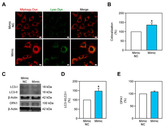 Figure 4. miR-378a-3p increases mitophagy in C2C12 myoblasts exposed to 3 days of glucose 25 mM. (A,B) Mtphagy dye (in red) and Lyso dye (in green) signals as well as the colocalization between them are increased when cells are transfected with miR-378a-3p mimic. Scale bar, 15 μm. (C) Representative images of Western Blot showing that the autophagy-related LC3-II/LC3-I ratio is increased for cells transfected with miR-378a-3p mimic, while mitochondrial fusion-related protein OPA1 was not altered. (D,E) Quantification of the LC3-II/LC3-I ratio and OPA1 protein content, respectively. All data is given as mean ± S.E.M. (n = 3). * p < 0.04 versus Mimic NC.