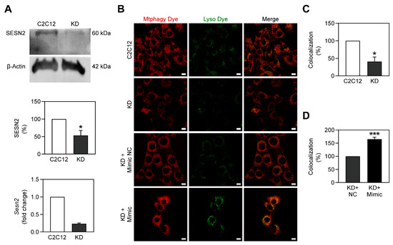 SESN2 is a protein that acts in response to metabolic stress by leading to the stimulation of several catabolic pathways [30]. More recently, SESN2 was identified as a crucial mediator of mitophagy, being involved in the PINK1-Parkin pathway [31]. To assess the relationship between miR-378a-3p and SESN2 in C2C12 cells, we knocked down the Sesn2 gene, generating Sesn2 KD C2C12 myoblasts (Figure 5A). As expected, the knockdown of Sesn2 led to a decrease of mitophagy in C2C12 myoblasts (Figure 5B,C), reinforcing the role of SESN2 in mitophagy. Afterwards, Sesn2 KD myoblasts were transfected with miR-378a-3p. The overexpression of this miRNA increased the fluorescence intensity of Mtphagy and Lyso dyes as well as their colocalization, suggesting that miR-378a-3p increased mitophagy in Sesn2 KD cells (Figure 5B,D) and thus hinting that it improves mitophagy through a mechanism independent of SESN2.