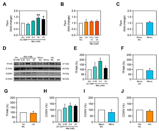 The protein content of TFAM was also assessed. TFAM tendentiously increases upon treatments with metformin but is not changed with either miR-378a-3p overexpression or silencing (Figure 6D–G). Additionally, COXIV content is not altered for either of the treatments (Figure 6H–J).