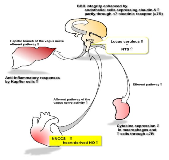 When the heart-derived non-neuronal ACh synthesis is activated, increased release of NO from cardiomyocytes stimulates the afferent pathway of the vagus nerve, leading to stimulation of the cholinergic and noradrenergic pathway in the brain through the NTS. The activated cholinergic system plays a role in increasing claudin-5 expression in brain endothelial cells, leading to the consolidation of BBB integrity. The efferent pathway of the vagus nerve, in turn, is activated to influence target organs including Kupffer cells in the liver as well as macrophages and T cells in the spleen. Those cells are regulated by the vagus nerve efferent pathway to attenuate inflammatory responses.
