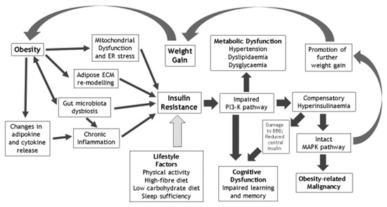 Weight gain and obesity mediates most of its direct medical sequelae through worsening insulin sensitivity and, as such, the development of insulin resistance (IR) [2]. In addition to malignancies such as endometrial carcinoma [1,3], IR underlies the cardio-metabolic dysfunction that associates with obesity. This includes type 2 diabetes mellitus (T2D) [1], polycystic ovary syndrome (PCOS) [4,5] and hypertension [6]. Furthermore, such obesity-related IR is compounded by the development of other obesity-related conditions such as obstructive sleep apnoea (OSA) [7] and male obesity-associated secondary hypogonadism (MOSH) [8]. As such, IR lies at a key junction that is itself influenced by multiple and complex pathways but also instigates multiple and complex downstream effects that ultimately manifest with metabolic and cognitive dysfunction.