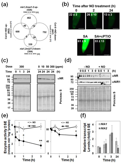 Exogenous NO negatively mimics endogenous NO deficiency. (a) Venn diagram showing the overlaps between up and down-regulated genes in NO-deficient nia1,2noa1-2 mutant plants and wild-type plants exposed to 300 ppm of NO gas. (b) Endogenous NO levels in wild-type roots were analyzed by treatment with DAF-FM DA fluorophore and images are representative of each condition. Positive and negative controls with salicylic acid (SA)-treated and NO scavenger cPTIO-treated roots, respectively, are shown. Values are the mean ± standard error of three independent replicates. Scale bars correspond to 100 μm. (c) Levels of NR protein in plants exposed to increasing NO concentrations and different times were detected by Western blot with an anti-NR antibody. (d) NR and NiR1 protein levels at early times after plants exposure to NO were detected by Western blot with an anti-NR and anti-NiR1 antibodies. Loading control is shown by Ponceau S stained membranes. The position of protein size markers (kDa) is shown on the left side. (e) Levels of NR and NiR activities in NO-exposed (+NO) and mock control (−NO) plants were quantified from two technical replicates for each of four independent biological replicates. (f) Transcript levels were measured by qRT-PCR with specific primers for NIA1 and NIA2 genes and ACT2 as a housekeeping gene and made relative to the levels detected at 0 time. Values are the mean of three independent replicates ± standard error. * p < 0.05 and ** p < 0.005 in Student’s t-test comparing +NO versus −NO at each time.