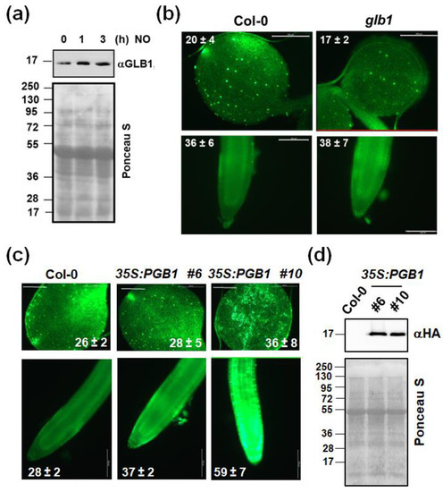 Effect of NO on GLB1/PGB1 protein levels and endogenous levels of NO in wild type, glb1 mutant, and PGB1 over-expressing transgenic plants. (a) GLB1/PGB1 protein levels at early times in hours (h) after plant exposure to NO were detected by Western blot with an anti (α)-GLB1,2 antibody (Agrisera). Loading control is shown by Ponceau S stained membrane. The position of protein size markers (kDa) is shown on the left side. (b,c), Cotyledon (upper panels) and roots (lower panels) of the indicated mutant and transgenic overexpressing plants after treatment with DAF-FM diacetate. NO content values inside each panel are the average of 3 to 6 independent samples ± SE. White bars represent 500 and 100 μm for cotyledon and root images, respectively. (d) GLB1/PGB1 protein levels in HA-tagged PGB1 over-expressing transgenic plants were detected by Western blot with anti (α)-HA-HRP antibody (Thermo Scientific). Loading control is shown by Ponceau S stained membrane. The position of protein size markers (kDa) is shown on the left side.