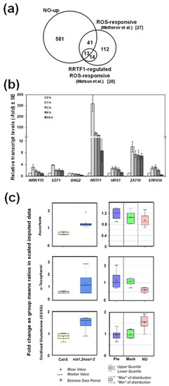 Effect of NO on the redox status of the plants. (a) Venn diagram showing the overlaps between NO up-regulated, ROS-responsive, and RRTF1-regulated genes. (b) Levels of ROS-related transcription factor encoding genes were analyzed by qRT-PCR with RNAs isolated, at the indicated times, from NO-exposed Col-0 plants. Values are the mean ± standard error of three independent biological replicates. (c) The levels of antioxidants were analyzed by LC-MS in Col-0 and the NO-deficient nia1,2noa1-2 mutant plants (left boxes) and wild type Col-0 plants (right boxes) before (Pre) and after 6 h exposure to 300 ppm NO (NO) or control untreated (Mock). Values are the mean of six independent biological replicates. The boxes represent the mean and median values with the upper and lower quartile limits as well as the maximum and minimum of the distribution and extreme data points.