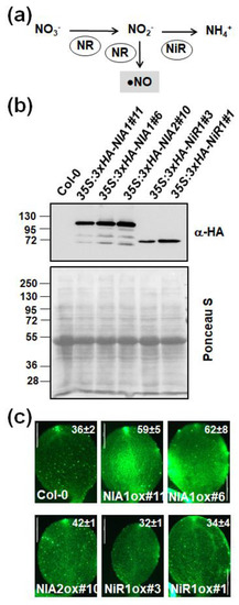 Levels of protein and endogenous NO content in plants overexpressing HA-tagged NIA1, NIA2, and NiR1 proteins. (a) Scheme showing nitrate assimilation pathway catalyzed by nitrate reductases (NR) and nitrite reductase (NiR) and the alternative reduction of nitrite to NO. (b) Levels of HA-tagged proteins were detected by Western blot with an anti-HA antibody coupled to horseradish peroxidase. Loading control is shown with Ponceau S stained membranes. The position of protein size markers (kDa) is shown at the left side. (c) Endogenous levels of NO in cotyledons of the indicated genotype after treatment with DAF-FM diacetate. Values are the mean ± standard error of three independent replicates. Scale bars correspond to 500 μm.
