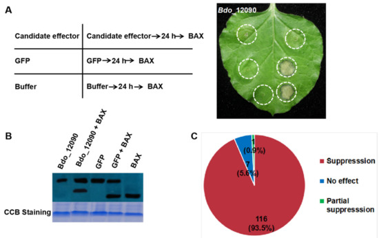 Suppression of BAX-triggered programmed cell death (BT-PCD) in N. benthamiana by candidate effectors in B. dothidea (example Bdo_12090). (A) Cell death suppression of Bdo_12090 by Agrobacterium-mediated transient expression in N. benthamiana. N. benthamiana leaves were infiltrated with buffer and Agrobacterium cells carrying Bdo_12090 or the GFP gene; infiltration was either performed alone or followed 24 h later by infiltration with Agrobacterium cells carrying a mouse Bax gene. The Representative photo was acquired 5 d after the last infiltration. Positions of Candidate effector, GFP, and Buffer in the left table correspond to the infiltration sites on the right leaf photograph, respectively. (B) Western blotting was used to confirm the expression of Bdo_12090, GFP and BAX in (A), and equal loading is indicated by coomassie blue (CBB) staining. (C) The number of candidate effectors and their proportion that showed suppression or no effect of BT-PCD on leaves of N. benthamiana.