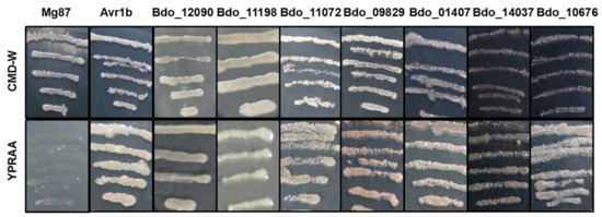 We used the yeast secretion system for validation in order to analyze the secretory activity of the predicted SPs of candidate effectors [29,35]. We randomly selected seven candidate effectors that suppressed the BT-PCD to test. Similar to the positive control Avr1b, the predicted SPs of the seven candidate effectors restored the growth of invertase-deficient yeast on YPRAA medium (Figure 3). This result suggests that the N-terminal peptides of these seven proteins are able to guide the secretion of the truncated invertase and the predicted SPs of the seven candidate effectors, thus, appear to be functional.