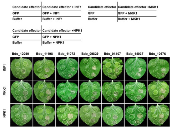 The assays of A. tumefaciens-mediated transient gene expression in N. benthamiana were performed, as previously described [21]. Specifically, the cells of A. tumefaciens carrying candidate effectors were grown overnight in Luria–Bertani medium containing 50 mg/mL kanamycin in a shaker at 28 °C and 180 rpm. The A. tumefaciens cells were harvested, washed three times with sterile double-distilled H2O, and then re-suspended in infiltration buffer (10 mM MES [pH 5.7], 10 mM MgCl2, and 150 µM acetosyringone) to a final OD600 of 0.5. After standing at room temperature for 3 h, the A. tumefaciens cells carrying candidate effectors were initially infiltrated via needleless syringes into the leaves of 4–6-week-old N. benthamiana plants. Fifteen leaves, three from each tobacco plant, were used per gene. Infiltrations of buffer and A. tumefaciens cells carrying pGR107-GFP were used as the controls. The leaves were initially infiltrated and then, 24 h later, the same infiltration site was challenged with A. tumefaciens cells carrying BAX, INFI, MKK1, or NPK1. The entire assay was repeated. Cell death symptoms on infiltrated leaves were observed and photographed six days after initial infiltration.