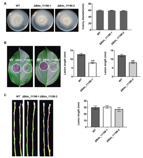 Functional analysis of effector Bdo_11198 in B. dothidea determined by colony characteristics and pathogenicity of gene knockout transformants. (A) The colony diamater of Bdo_11198 knockout mutants and wild-type (WT) on potato dextrose agar (PDA). (B) Pathogenicity on wounded apple leaves and (C) on wounded shoots were tested by inoculating with mycelial blocks of WT and Bdo_11198 knockout mutants, respectively. The lesion size was measured and symptoms were photographed five days after inoculation. Data represent means ± standard error of mean (SEM) from two independent experiments. **: significant at p < 0.01.