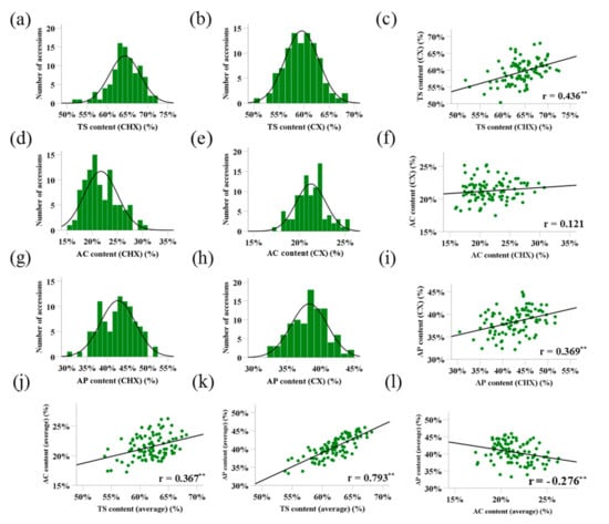 Frequency distribution and correlation analysis of TS, AC and AP content. (a,b) the frequency distribution of TS in Changxing and Cixi; (c) the correlation of TS between Changxing and Cixi; (d,e) the frequency distribution of AC in Changxing and Cixi; (f) the correlation of AC between Changxing and Cixi; (g,h) the frequency distribution of AP in Changxing and Cixi; (i) the correlation of AP between Changxing and Cixi; (j) the correlation of TS and AC; (k) the correlation of TS and AC; (l) the correlation of AC and AP. TS, Total starch content; AC, Amylose content; AP, Amylopectin content. ** representing significance at p < 0.01 level, respectively (two-tailed).