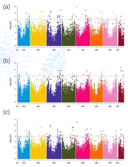 Manhattan plots for amylopectin content. (a) Manhattan plot of E1 (Changxing). (b) Manhattan plot of E2 (Cixi). (c) Manhattan plot of the average data. Dashed line represents the significance threshold (p < 10−4).