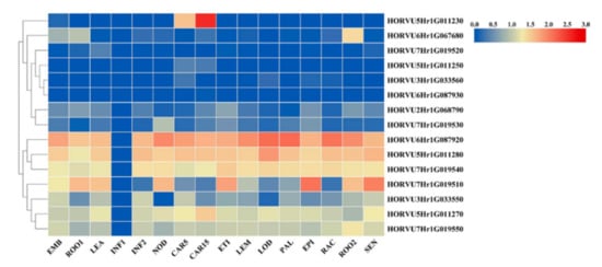 Heatmap of 15 candidate genes expression level in different tissues and developing stages. EMB: 4-day embryo, ROO1: Roots from seedlings (10 cm shoot stage), LEA: Shoots from seedlings (10 cm shoot stage); INF1: Young developing inflorescences (5 mm); INF2: Developing inflorescences (1–1.5 cm); NOD: Developing tillers, 3rd internode (42 DAP); CAR5: Developing grain (5 DAP); CAR15: Developing grain (15 DAP); ETI: Etiolated seedling, dark cond. (10 DAP); LEM: Inflorescences, lemma (42 DAP); LOD: Inflorescences, lodicule (42 DAP); PAL: Dissected inflorescences, palea (42 DAP); EPI: Epidermal strips (28 DAP); RAC: Inflorescences, rachis (35 DAP);ROO2: Roots (28 DAP). SEN: Senescing leaves (56 DAP).