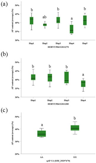 Haplotype analysis showed that HORVU5Hr1G011270 and HORVU5Hr1G011280, two of the four candidate genes, contributed to highly significant difference in AP content (p < 0.01) (Figure 4a,b; Tables S6 and S7). The gene HORVU5Hr1G011270 contains 11 SNPs polymorphisms, involving five haplotypes in 100 BSC collection (Table S6). The mean AP content of Hap4 was 36%, being significantly lower than that of other four hyplotypes. On the other hand, there were five SNPs polymorphisms for the gene HORVU5Hr1G011280, resulting in four hyplotypes (Table S7). The mean AP content of Hap4 was 38%, being significantly lower than that of other three hyplotypes. Moreover, these two genes were also the candidate genes of the same QTL (qAP-5.1, marker S5H_29297679), which is associated with AP content in barley grains. Among 100 barley accessions, two groups could be divided based on the polymorphism of the marker S5H_29297679; 93 accessions had allele GG and 7 accessions had AA for the locus. The polymorphism of this marker fits well with the phenotypic data (Figure 4c). The mean AP content of AA type was 32.95%, being significantly (p < 0.001) lower than that of GG type (40.79%). Moreover, this QTL was also associated with TS. Therefore, it may be suggested that this QTL and the associated candidate genes are important in determining AP content in barley grains.