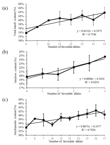 Linear regression analysis for the number of favorable alleles and starch content. (a), total starch content; (b), amylose content; (c), amylopectin content.