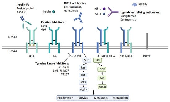 - Yee, D. A tale of two receptors: Insulin and insulin-like growth factor signaling in cancer. Clin. Cancer Res. 2015, 21, 667–669. [Google Scholar] [CrossRef][Green Version]