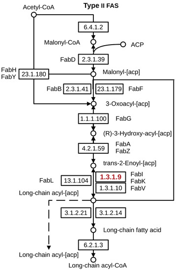 - Massengo-Tiassé, R.P.; Cronan, J.E. Diversity in enoyl-acyl carrier protein reductases. Cell. Mol. Life Sci. 2009, 66, 1507–1517. [Google Scholar] [CrossRef]