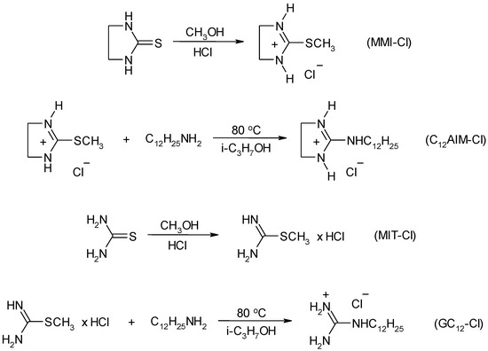 S-methylisothiuronium chloride (MIT-Cl) was synthesized by the method similar to that described for the synthesis of 2-methylmercaptoimidazoline-2 chlorohydrate, using thiourea instead of ethylenethiourea. Yield: 65% (32 g), white solid, mp 116 °C. The ionic liquid C12G-Cl was prepared using the method similar to that described for the synthesis of C12AIM-Cl, using S-methylisothiuronium chloride instead of 2-methylmercaptoimidazoline-2 chlorohydrate (Scheme 4). After recrystallization from ethyl acetate-hexane (1:2 v/v) mixture, white solid residue was obtained. Yield: 65% (17 g), white solid, mp 116 °C.