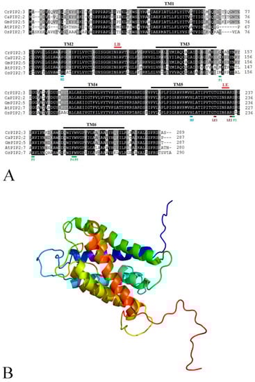 Protein sequence, transmembrane domain prediction, and phylogenetic analyses of the CrPIP2;3 protein. (A) Sequence alignment analysis of CrPIP2;3 with other known PIP proteins. The conserved amino acid residues in all proteins are highlighted in black and gray. The MIP domain (PF00230) is marked with a green frame. Six transmembrane helices domains (TM1–TM6) and two conserved Asn–Pro–Ala (“NPA”) motifs (LB and LE) are marked with black and red solid lines. The aromatic/arginine (ar/R) selectivity filters (H2, H5, LE1, and LE2) and Froger’s positions (FPs) (P1, P2, P3, P4, and P5) are marked with blue, brown, and green solid lines, respectively. The MIP signal sequence between TM2 and TM3 is also lined in a gray color. (B) Predicted 3D structure of CrPIP2;3 generated using the Phyre2 server. (C) The phylogenic tree of CrPIP2;3 and other PIP proteins from A. thaliana and soybean. The black triangle symbol showed the position of CrPIP2;3.