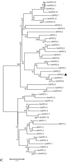 Aquaporins (AQPs) are highly conserved integral membrane channel proteins, also known as major intrinsic proteins (MIPs), that are mainly involved in water movement across membranes in cells [,]. AQPs show highly conserved structures whereby six membrane-spanning alpha helices are linked by five loops with their N- and C-termini into the cytosol. Two of these loops contain highly conserved asparagine–proline–alanine (NPA) motifs, which are of importance in the formation of water-selective channels [,]. AQPs are widely distributed in all living organisms, from prokaryotes to plants and animals, and their ability to transport water and other neutral small molecules has been confirmed by a series of experiments in vivo or in vitro []. In plants, many AQPs have been reported to play essential roles in regulating water potential and transport in vascular plants [,]. Genome sequencing has indicated that plant AQPs constitute a large gene family, basically containing tens of members that can be classified into five subfamilies based mainly on their subcellular localization []. These subfamilies include plasma membrane intrinsic proteins (PIPs), tonoplast intrinsic proteins (TIPs), nodulin-like plasma membrane intrinsic proteins (NIPs), small intrinsic proteins (SIPs), and X intrinsic proteins (XIPs). Among them, plant PIPs are the largest group of plant aquaporins and are considered the main water transport pathway across plasma membranes in root and leaf tissues, thus playing important roles in plant–water relations [].