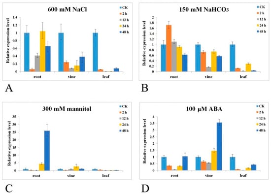 Expression pattern analyses of CrPIP2;3 in C. rosea tissues. Time-course transcriptional levels of CrPIP2;3 in the root, vine, and leaf in response to (A) salt; (B) salt–alkali; (C) high osmotic stress; and (D) ABA treatment. Error bars indicate the ±SD based on three replicates. In different tissues under various treatments, all of the expression levels were compared with CK (control check, the beginnings of each treatment).