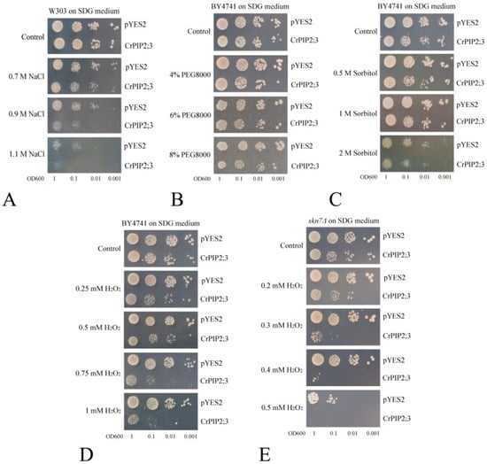 Spot assay for salt, osmotic stress, and H2O2 tolerance in yeast. Dot-spot assays for (A) salt-tolerance (different concentrations of NaCl) in the yeast wild-type (W303) expressing CrPIP2;3 (carrying CrPIP2;3-pYES DEST52) or control (carrying pYES2); (B) high osmotic stress tolerance (different concentrations of PEG8000) in the yeast wild-type (BY4741); (C) high osmotic stress tolerance (different concentrations of sorbitol) in the yeast wild-type (BY4741); (D) oxidative stress tolerance (different concentrations of H2O2) in the yeast wild-type (BY4741), and (E) oxidative stress tolerance (different concentrations of H2O2) in the H2O2-sensitive yeast mutant strain skn7Δ.