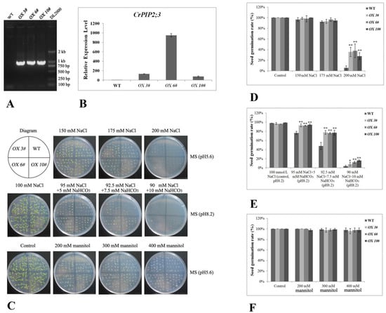 To further evaluate the effects of CrPIP2;3, A. thaliana transgenic plants ectopically expressing CrPIP2;3 under the control of the 35S promoter were generated. After confirmation with genomic PCR (Figure 5A) and qRT-PCR (Figure 5B), three homozygous T3 line plants (OX 3#, OX 6#, and OX 10#) were selected and applied in the following tests. Briefly, about 30 sterilized seeds were spotted on the MS medium with the addition of salt, saline-alkaline, or mannitol stress, following which the germination rate was calculated. As indicated in Figure 5C, a difference in the germination of the WT and CrPIP2;3 OX lines could be observed, and the germination of the CrPIP2;3 OX lines was higher than that of the WT when the seeds were grown in MS medium containing 200 mM NaCl or 5, 7.5, and 10 mM NaHCO3, and the corresponding statistical analysis of the seed germination rates also showed consistent results with the germination status, with better salt and alkali tolerance (Figure 5D,E). There was little difference in the seed germination rates between the WT and transgenic plants under osmotic stress (200, 300, and 400 mM mannitol) (Figure 5C). Although the CrPIP2;3 OX lines produced a larger radicle and hypocotyl than WT under 400 mM mannitol stress, the statistical analysis of the seed germination rates did not indicate obvious differences between WT and the three CrPIP2;3 OX lines (Figure 5F).