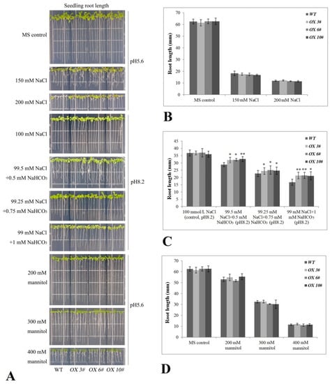To evaluate the seedling tolerance to salt, alkali, or hyperosmotic stress, the root lengths of the OX 3#, OX 6#, OX 10#, and WT seedlings were also measured after 7 d of different stress challenges. In short, seeds were germinated on MS plates for 3 d under suitable conditions, following which the sprouts were transferred onto MS plates supplied with 100, 150, and 200 mM NaCl (salt stress), 0.5 mM NaHCO3 plus 99.5 mM NaCl (pH 8.2), 0.75 mM NaHCO3 plus 99.25 mM NaCl (pH 8.2), and 1 mM NaHCO3 plus 99 mM NaCl (pH 8.2) (alkali stress), or 200, 300, and 400 mM mannitol (hyperosmotic stress). The seedling lengths were calculated, and photographs were taken.
