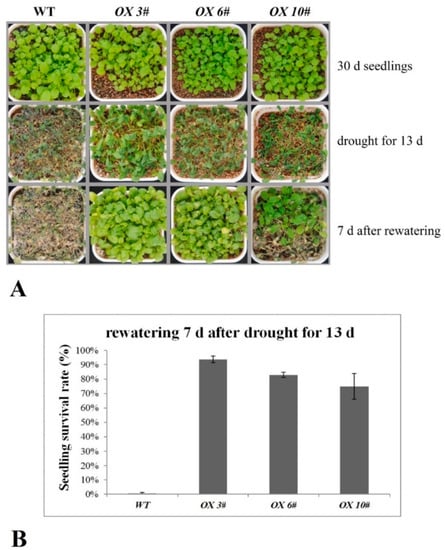 Seeds of the WT and CrPIP2;3 OX lines were grown under well-watered conditions for 30 d, and before salt, drought, and alkali stress treatment, the growth status of the adult plants (WT and three CrPIP2;3 OX lines) was relatively consistent. There was no difference in the tolerance of the adult plants between the WT and transgenic lines (OX 3#, OX 6#, and OX 10#) under salt (200 mM NaCl) or salt–alkali (100 mM NaHCO3, pH 8.2) stresses (results not shown). Apparently, CrPIP2;3 strongly improved the drought tolerance during the growth of the adult plants (Figure 7A). After 13 d of withholding water, the plants were wilted to different degrees in both the WT and three CrPIP2;3 OX lines. After re-watering and growth for another 7 d, the WT plants did not recover and appeared to exhibit a lethal phenotype, while most of the CrPIP2;3 OX plants in all three lines recovered and remained alive, with an obviously higher survival rate than that of the WT (Figure 7B). This result indicates that CrPIP2;3 overexpression increased plant resistance to drought.