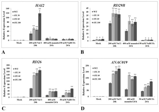 For detecting the expression of antioxidative system-related genes (CAT1, CSD1, APX1, and FSD1) and abiotic stress-related genes (HAI2, RD26, RD29B, and ANAC19) in three-week-old A. thaliana (WT or transgenic lines OX 3#, OX 6#, and OX 10#) planted in soil, the total RNA was isolated from the rosette leaves at different time points (with or without stress treatments, including 200 mM NaCl, 400 mM mannitol, or 50 mM NaHCO3 at pH 8.2), and cDNA synthesis was performed using the above procedure. The reference gene for the qRT-PCR was AtACT2 (At3g18780) in A. thaliana. The primers used for qRT-PCR are listed in Table S3.