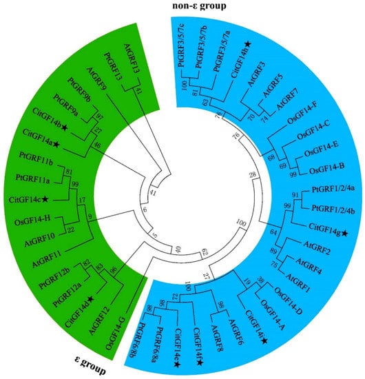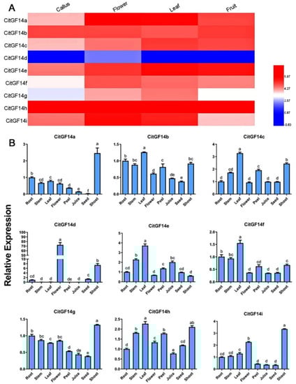 3.2. CitGF14s Were Differentially Expressed in Various Organs of Citrus