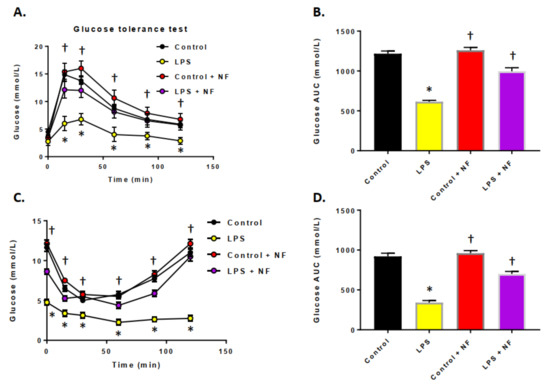 Effect of acute lipopolysaccharide (LPS) administration on glucose and insulin tolerance. (A) Oral glucose tolerance test (OGTT, 2 g/kg, p.o.) performed 6 h after acute intraperitoneal injection of control (saline, n = 10/group), LPS (2 mg/kg, n = 10/group, control plus NutriFusion (NF) diet (saline, n = 10/group), LPS + NF diet (2 mg/kg, n = 10/group; repeated measures one-way ANOVA followed by Bonferroni’s test (d = 1.14). (B) AUC of glucose response; Student’s t-test. (C) Insulin tolerance test (ITT, 0.5 U/kg, i.p.) performed 6 h after injection of control (saline, n = 10), LPS (2 mg/kg, n = 10/group), control plus NF diet (saline, n = 10/group), LPS + NF diet (2 mg/kg, n = 10/group; repeated measures one-way ANOVA followed by Bonferroni’s test (η2 = 0.108). (D) AUC of insulin response; one-way ANOVA followed by Bonferroni’s test. Values are mean ± SEM. * p < 0.01 compared to control group, † p < 0.01 compared to LPS group.