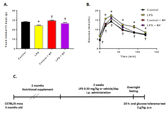 Effect of chronic lipopolysaccharide (LPS) administration on food intake and glucose tolerance. (A) Food intake during 13 days with repeated daily injection of control (saline, n = 10), LPS (0.33 mg/kg/day, i.p., n = 10/group), control plus NF diet (saline, n = 10/group), LPS + NF diet; Student’s t-test. (B) OGTT performed at the end of the repeated daily injection of control (saline, n = 10/group), LPS (0.33 mg/kg, i.p., n = 10/group), control plus NF diet (saline, n = 10/group), LPS + NF diet; repeated measures one-way ANOVA followed by Bonferroni’s test (d = − 0.62). (C) Diagram of experimental design; Student’s t-test. * p < 0.01 compared to control group, † p < 0.01 compared to LPS group.