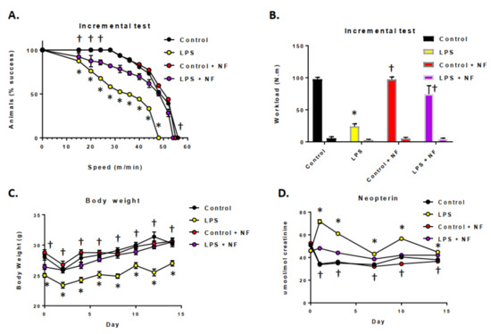 Effect of bacterial lipopolysaccharide (LPS) administration on exercise performance, and urinary neopterin levels in the striatum. (A) Mouse physical performance on treadmill incremental loading test (n = 10/group); log-rank (Mantel–Cox). The animals were adapted to the treadmill for 5 consecutive days at a speed of 10 m/min for 10 min. The incremental loading test was performed 24 h after a single dose of control (saline), LPS injection (0.33 mg/kg, i.p.), control plus NF diet (saline), LPS + NF diet (n = 10/group). (B) Vertical (lower bars) and horizontal (higher bars) workloads during incremental loading test; one-way ANOVA followed by the Bonferroni test. (C) Body weight and (D) urinary neopterin production (n = 10/group); repeated measures one-way ANOVA followed by Bonferroni’s test. Values are mean ± SEM. * p < 0.01 compared to control group, † p < 0.01 compared to LPS group.