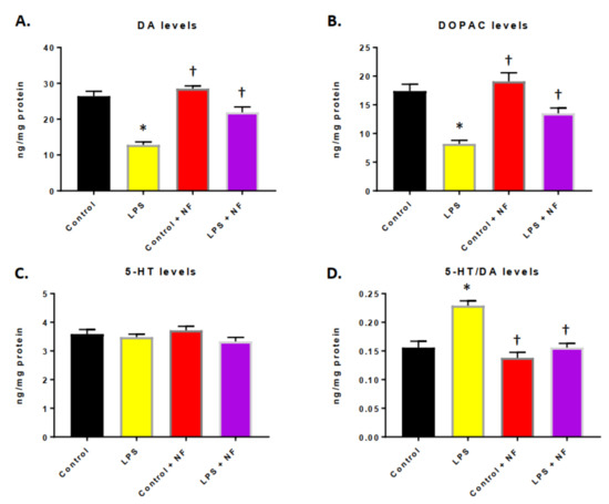 Effect of bacterial lipopolysaccharide (LPS) administration on monoamine levels in the striatum. (A) Dopamine (DA), (B) 3,4-dihydroxyphenyilacetic acid (DOPAC), (C) serotonin (5-HT) levels and (D) 5-HT/DA ratio in control (saline), LPS injection (0.33 mg/kg, i.p.), control plus NF diet (saline), LPS + NF diet (n = 10/group); Student’s t-test. Values are mean ± SEM. * p < 0.01 compared to control group, † p < 0.01 compared to LPS group.