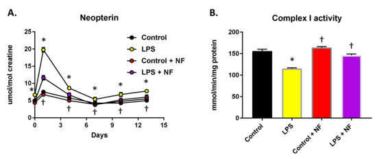 Effect of nutritional diets on inflammatory response (animals submitted to nutritional diets for 2 months). Afterwards, mini-osmotic pumps containing LPS 0.83 mg/kg/day were implanted and LPS was infused for 2 weeks. (A) Neopterin urinary levels; repeated measures two-way ANOVA followed by Bonferroni’s test. Groups were: control (saline), LPS injection (0.33 mg/kg, i.p.), control plus NF diet (saline), and LPS + NF diet. (B) Complex I activity in skeletal muscle (n = 10/group); two-way ANOVA followed by Tukey’s test. Values are mean ± SEM. * p < 0.01 compared to control group, † p < 0.01 compared to LPS group.