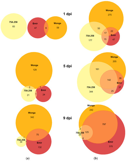 Venn diagrams showing the number of (a) downregulated and (b) upregulated genes in Lupinus angustifolius lines subjected to Diaporthe toxica inoculation. The analyzed lines were as follows: 75A:258 (highly resistant, carrying the Phr1 gene), Wonga (moderately resistant, carrying the PhtjR gene), and Emir (susceptible). dpi stands for days post inoculation.