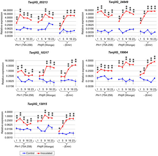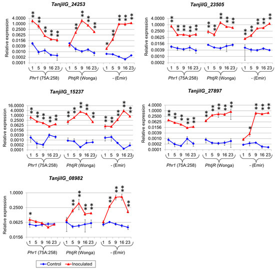 Expression profiles of genes that revealed the maximum level at the first time point in the 75A:258 line. The numbers 1, 5, 9, 16 and 23 stand for days post inoculation. LanDExH7 and LanTUB6 were used for the normalization, and LanTUB6 dilution was used for inter-run calibration. The error bars indicate the standard deviation of three biological replicates, with each representing a mean of three technical replicates. The statistical significance of differences in the expression levels between the inoculated and control plants are marked above the data points (* p-value ≤ 0.05, ** p-value ≤ 0.001). A logarithmic scale was used to accommodate the observed differences in gene expression. Analyzed lines of Lupinus angustifolius: 75A:258 (highly resistant, carrying the Phr1 gene), Wonga (moderately resistant, carrying the PhtjR gene), and Emir (susceptible).